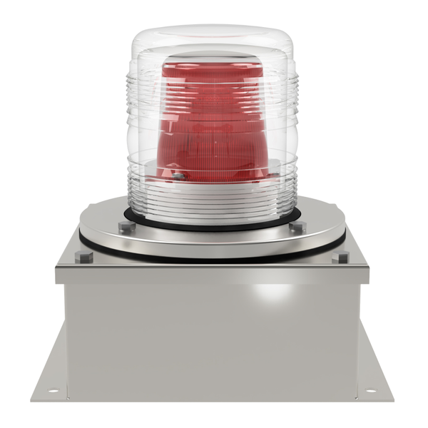 A highly rugged xenon beacon with a glass lens, made from AISI316 stainless steel and featuring chemical-resistant seals and stainless steel fixings. This beacon is designed for harsh conditions like paper manufacturing, where acid-wash cleaning is routine. The clear glass outer lens is paired with internal polycarbonate lenses in Red, Amber, Green, Blue, Yellow, or Clear. Onboard switches provide the option of four selectable flash rates. The beacon is available in 11 Joule versions, compatible with 12Vuc, 24Vuc, 115Vac, or 230Vac supplies, with the choice of Double-flash or Single-flash signalling. Supplied as a boxed beacon, with 5 Joule models available for 10-100Vdc (20-70Vac) and 100-130Vdc supplies.